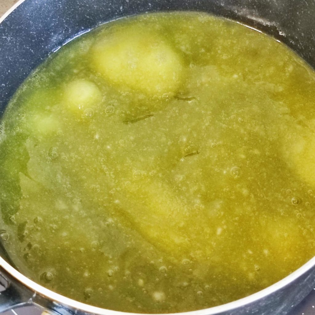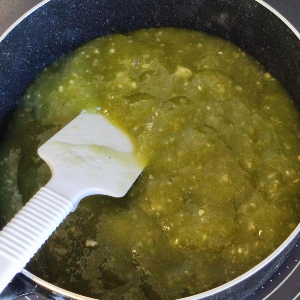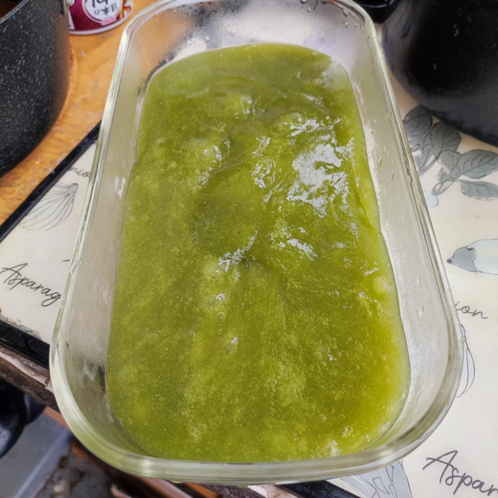 サイリウム (オオバコ)を利用してつくったわらび餅です 四葉パウダーを加えて鮮やかなグリーン色にしました 今回はダマが残らないようにハンドミキサーを利用しました