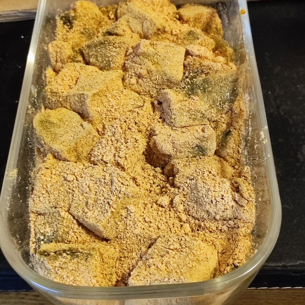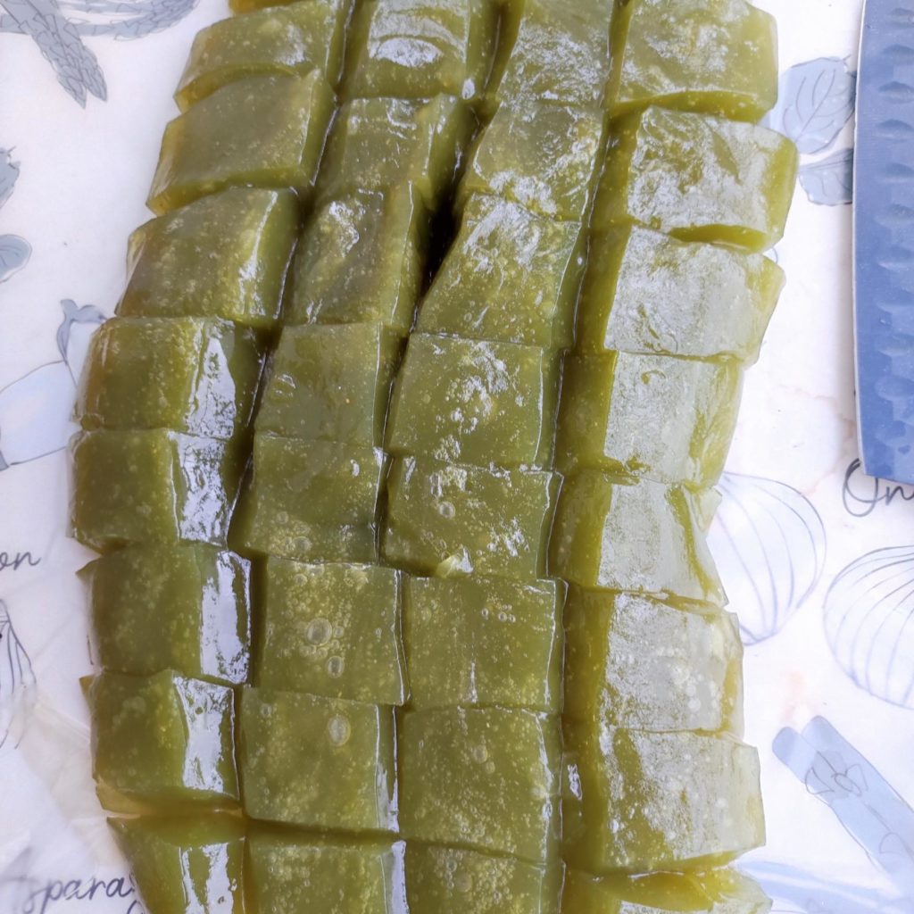 - ぷよぷよに固まったので、まな板に出し、包丁で、食べやすい大きさに切りました