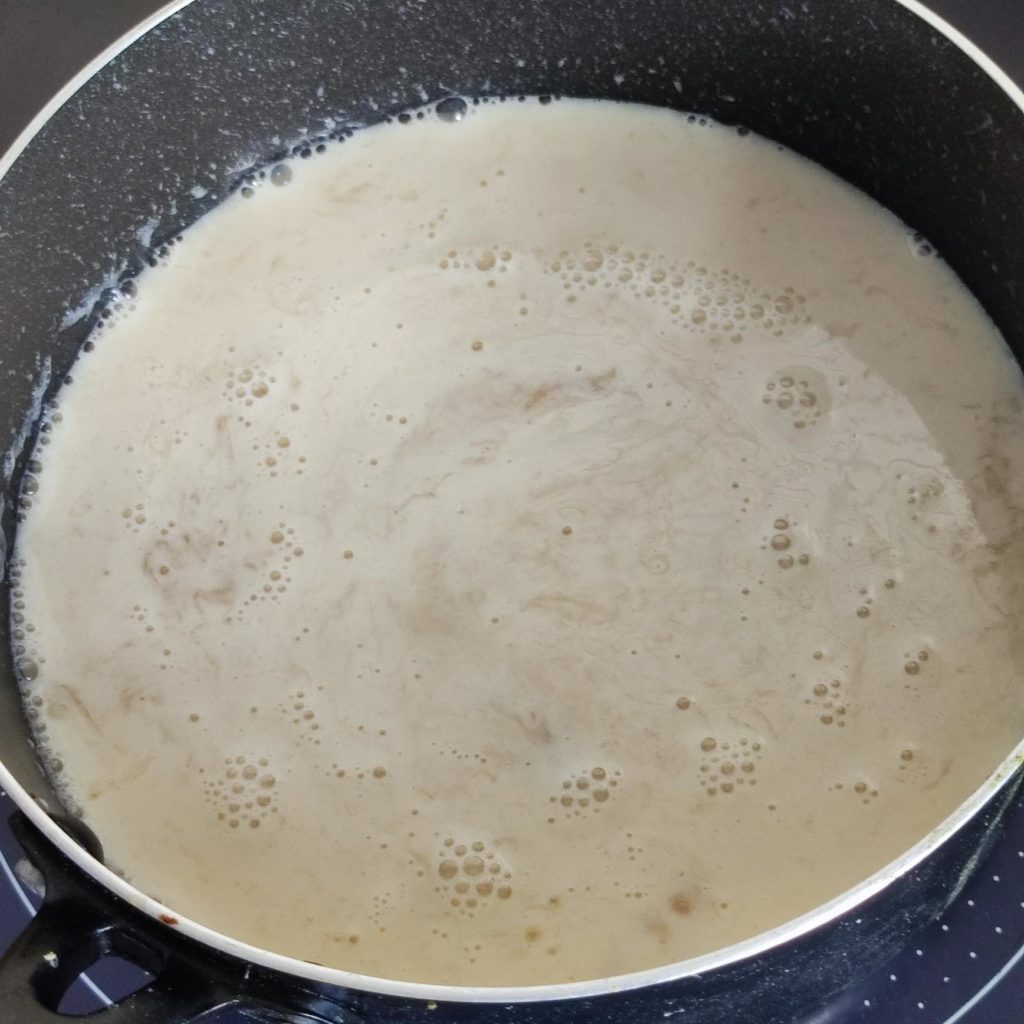 6. 豆乳を入れてよく混ぜます。