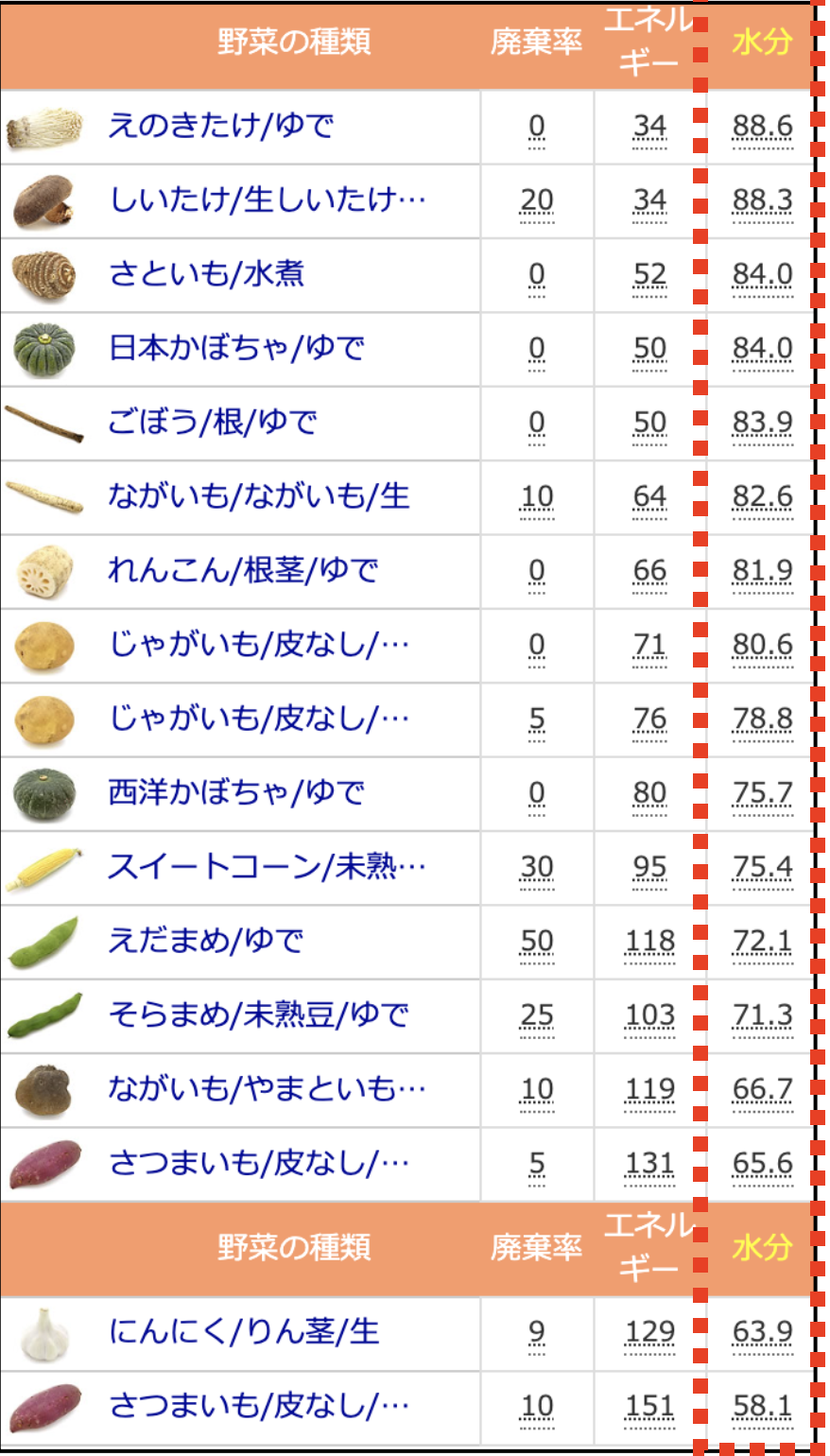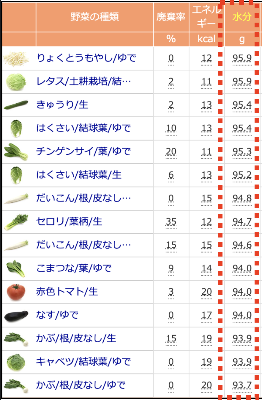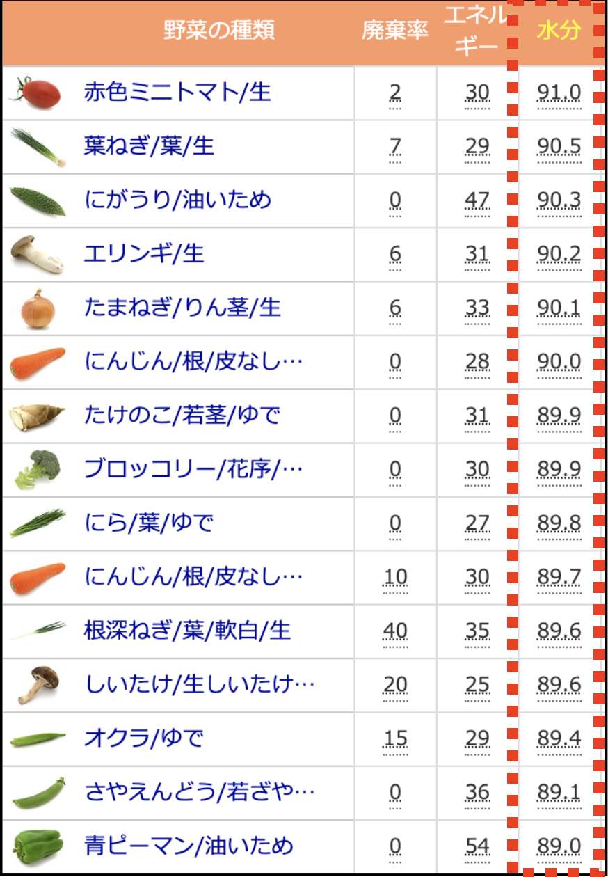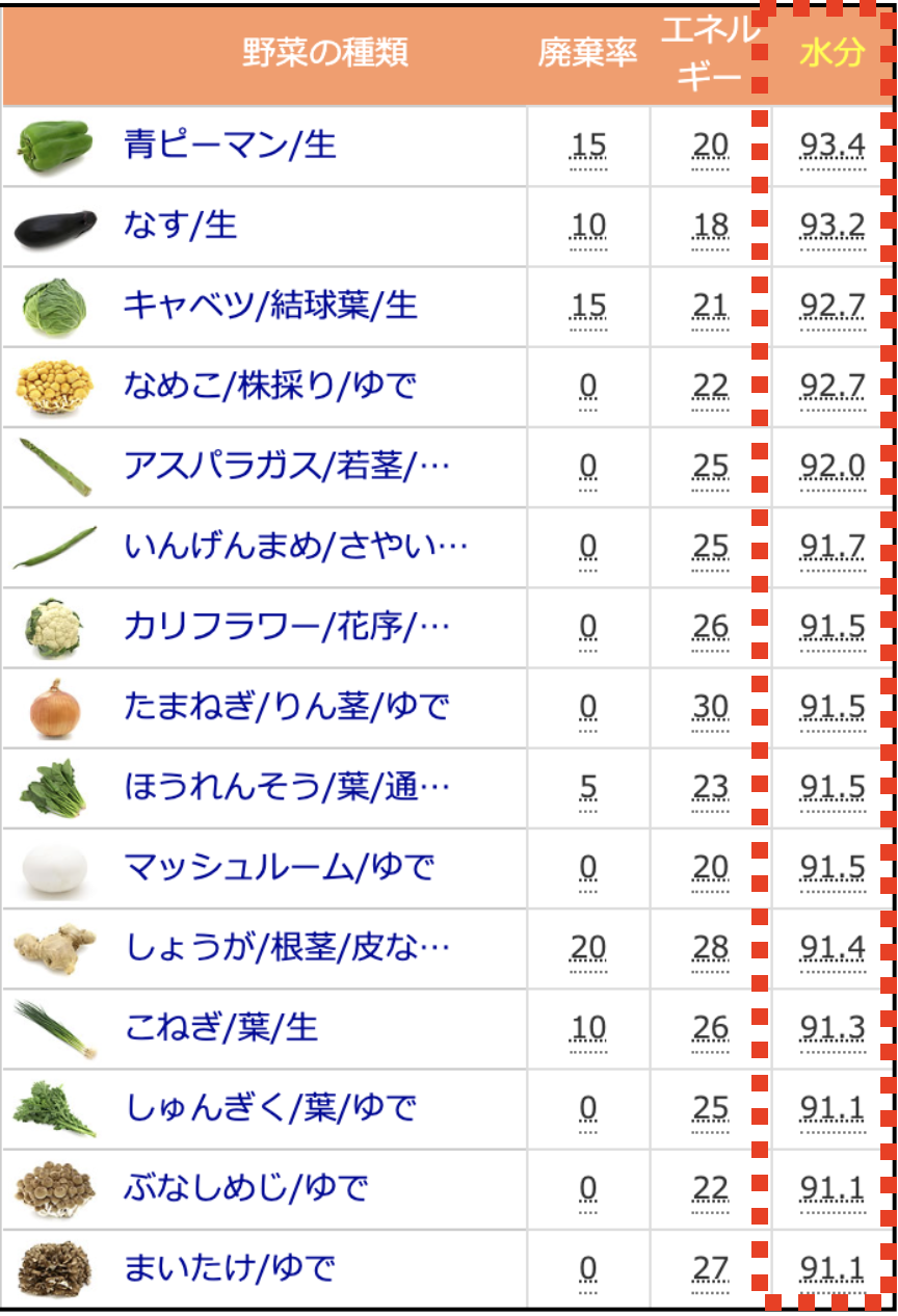野菜の水分含有量:重い買い物というのは水分を運んでいることなんですね
