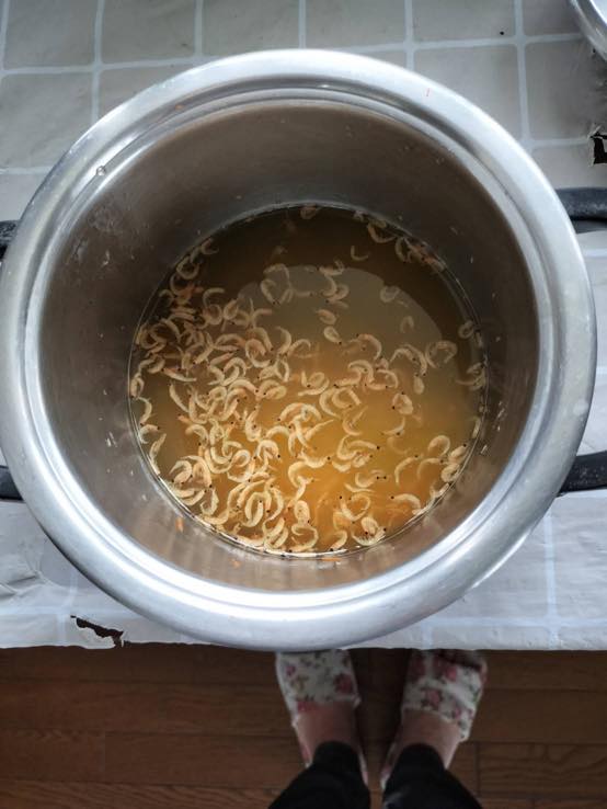 カレーに具材で残った人参も剃って入れ、浮いてるのは旨味的に入れた乾燥海老少々です